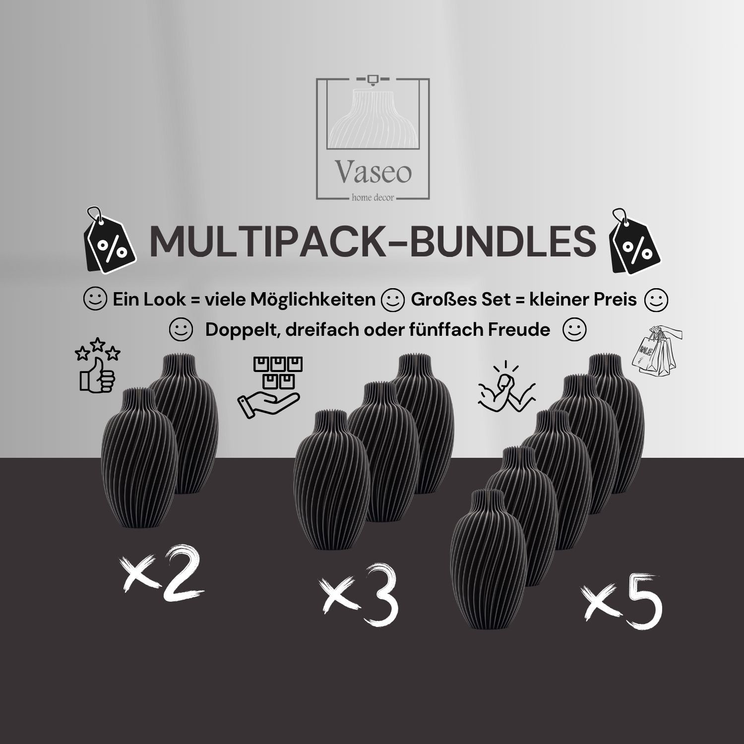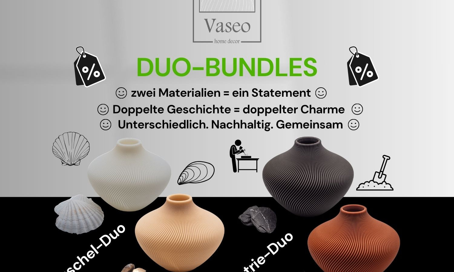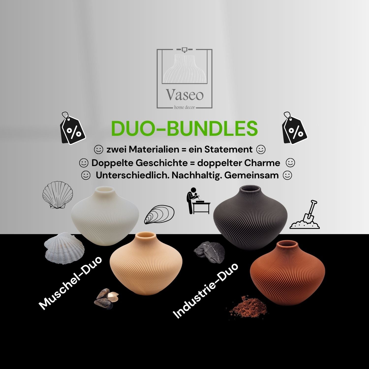 Entdecke unsere praktischen Vasen-Bundles: Ob als Duo-Set mit verschiedenen Recyclingmaterialien, als Multipack in deiner Lieblingsfarbe oder im Klein-und-Groß-Kombipaket – mit unseren Sets profitierst du von attraktiven Preisvorteilen. Ideal zum Verschenken oder zum Kombinieren in deinem Zuhause. Nachhaltig, stilvoll & clever gespart.