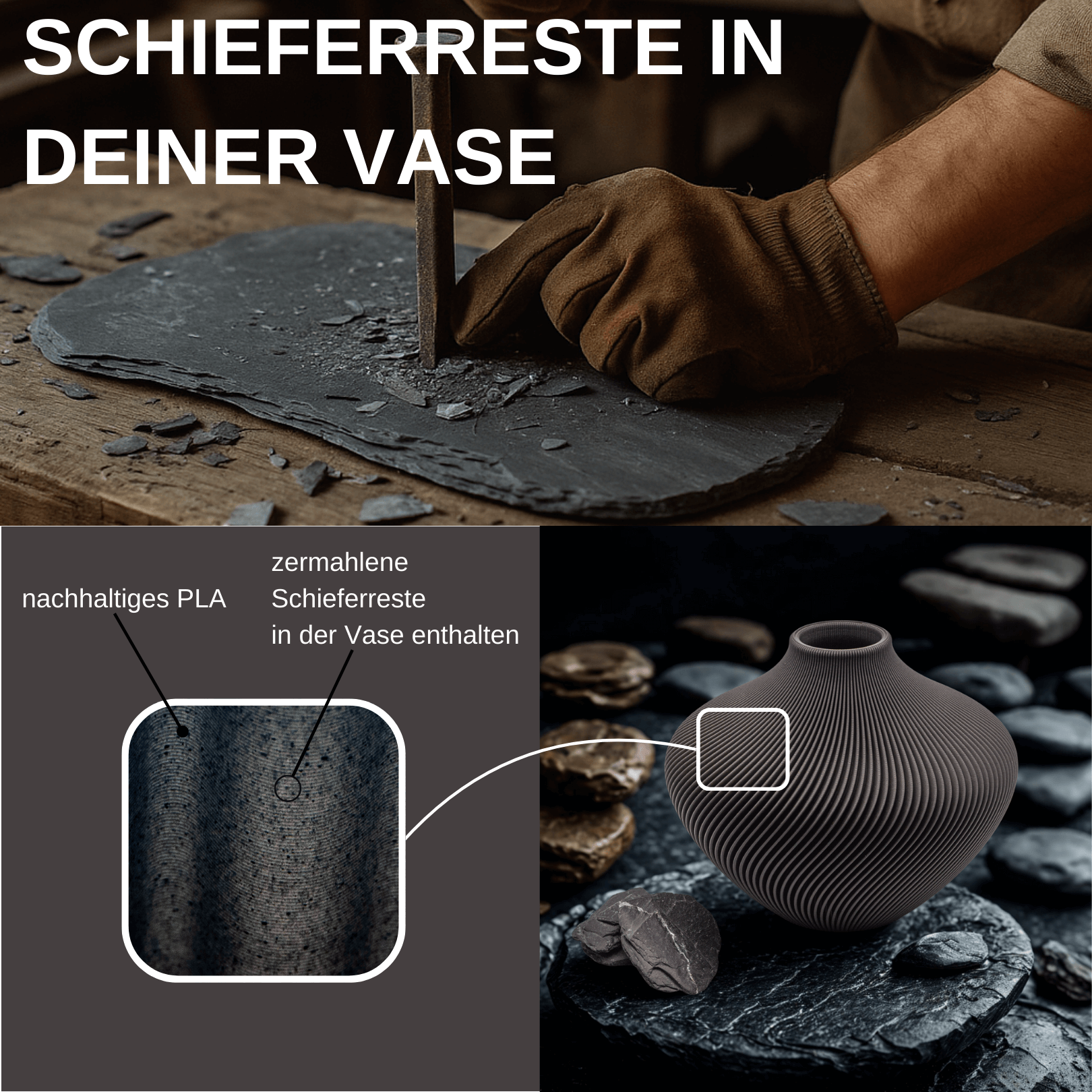Reste aus der Bearbeitung von Schieferplatten werden nicht entsorgt, sondern gesammelt, zermahlen (0,01 mm) und mit kompostierbarem PLA kombiniert.