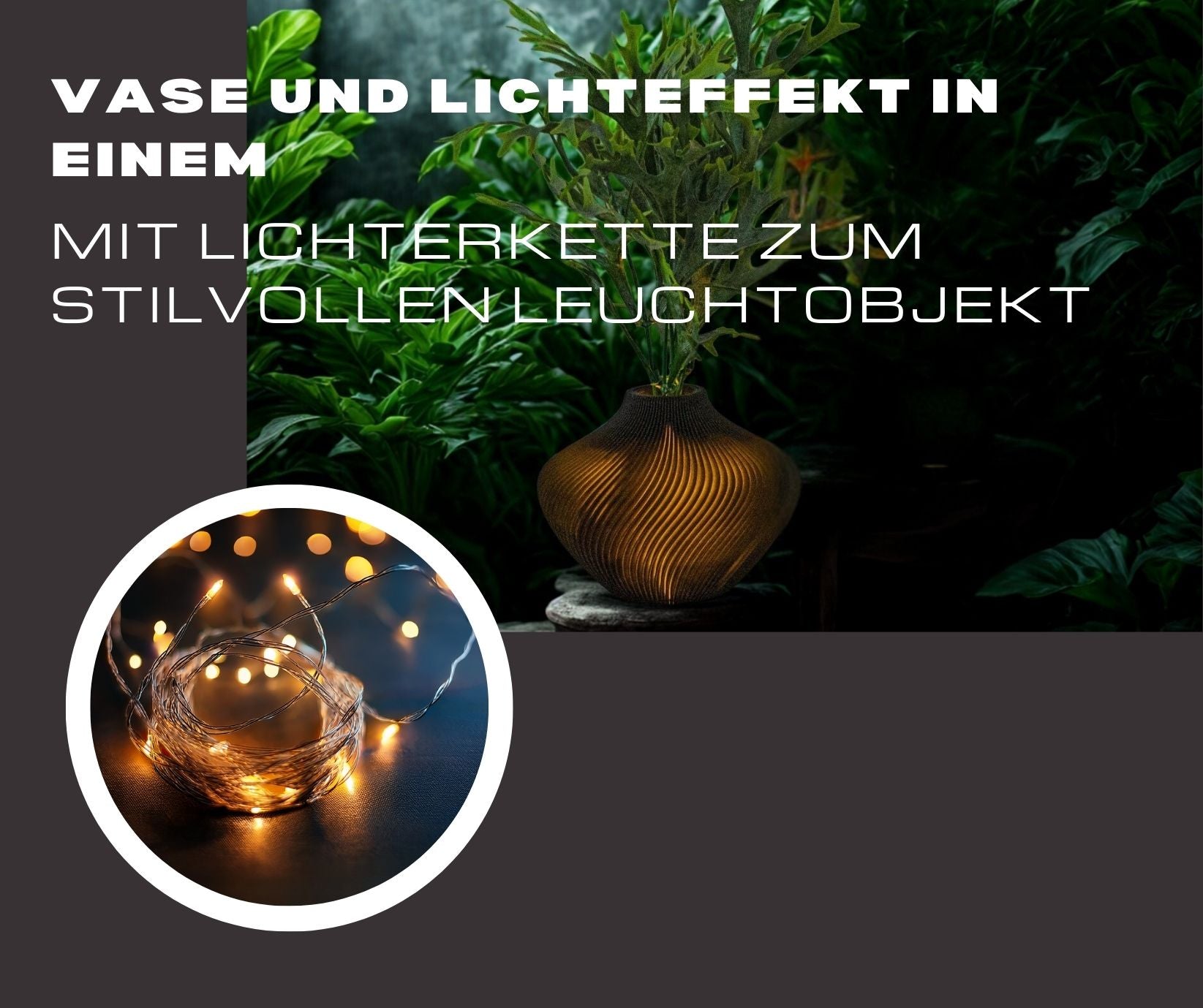 Nein, eine Lichterkette ist nicht im Lieferumfang enthalten. Du kannst jedoch jede handelsübliche LED-Mikrolichterkette verwenden, um deine Vase zum Leuchten zu bringen. Durch das leicht lichtdurchlässige Material entsteht dabei ein wunderschöner, warmer Effekt.