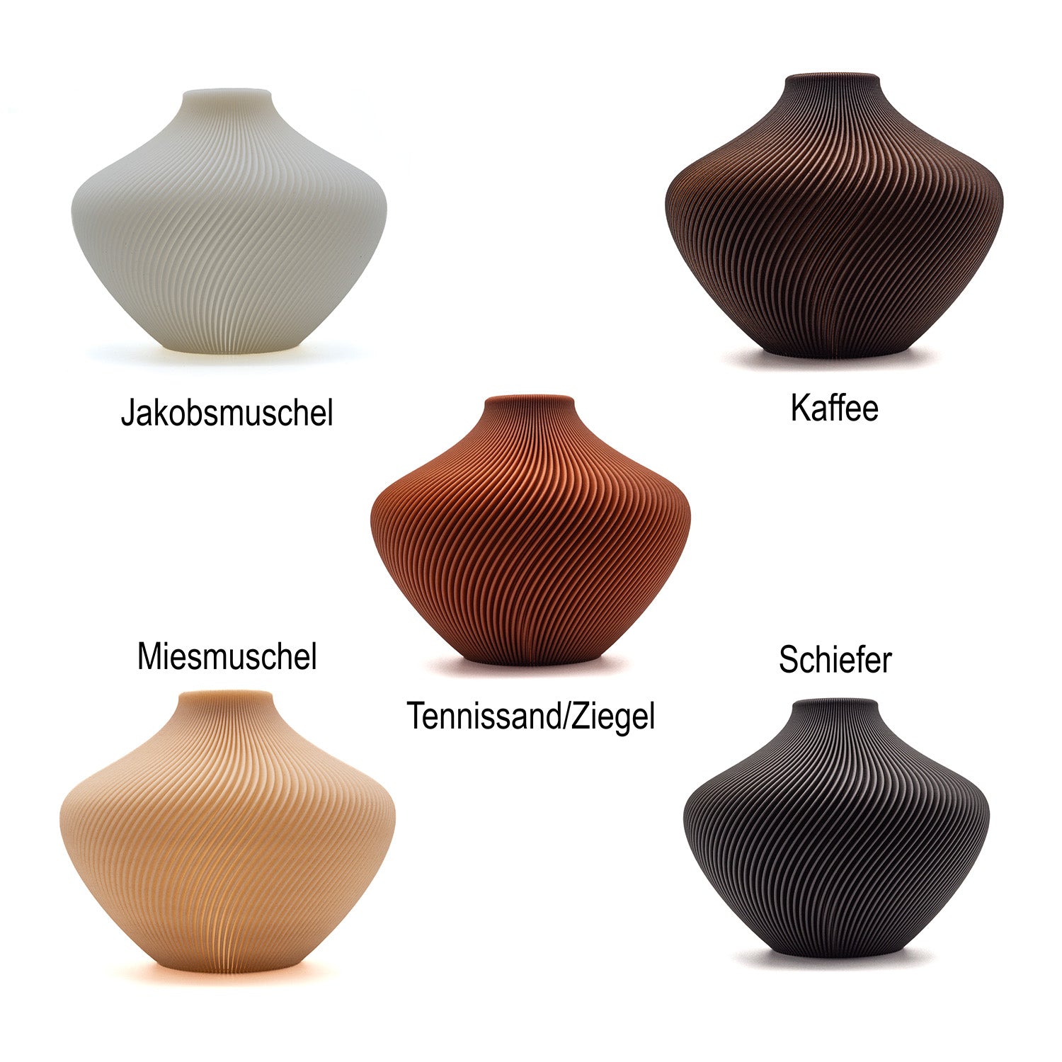 Unsere Vasen bestehen ausPLA, einem umweltfreundlichen Biokunststoff auf Basis von Maisstärke, kombiniert mitrecycelten Industrierestenwie Kaffee, Schiefer, Ziegelmehl, Muschel- oder Jakobsmuschelschalen. Was einst Abfall war, wird zu einem neuen Designobjekt –aus Resten wird Stil. Jede Vase ist ein kleines Unikat mit eigener Struktur und Farbe.