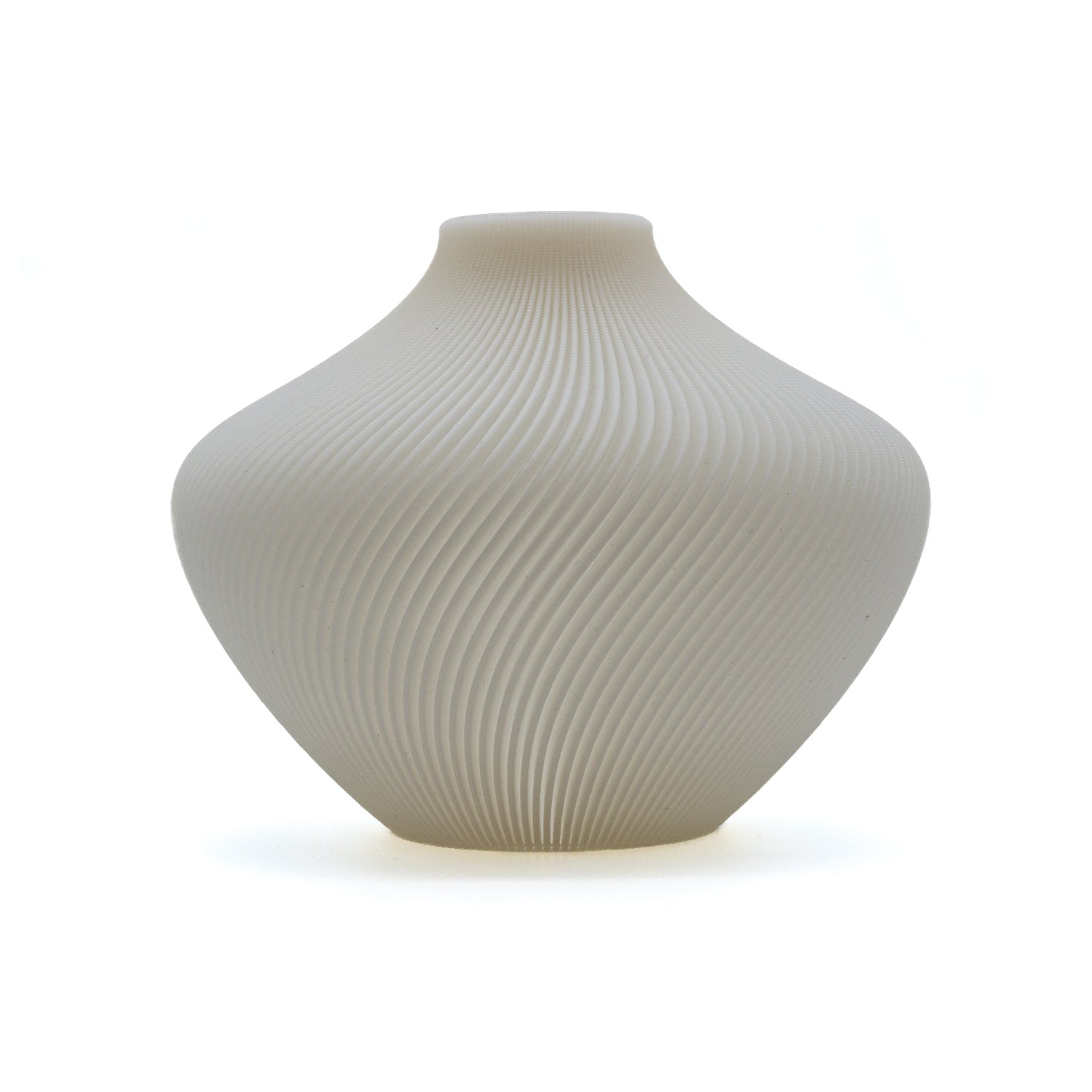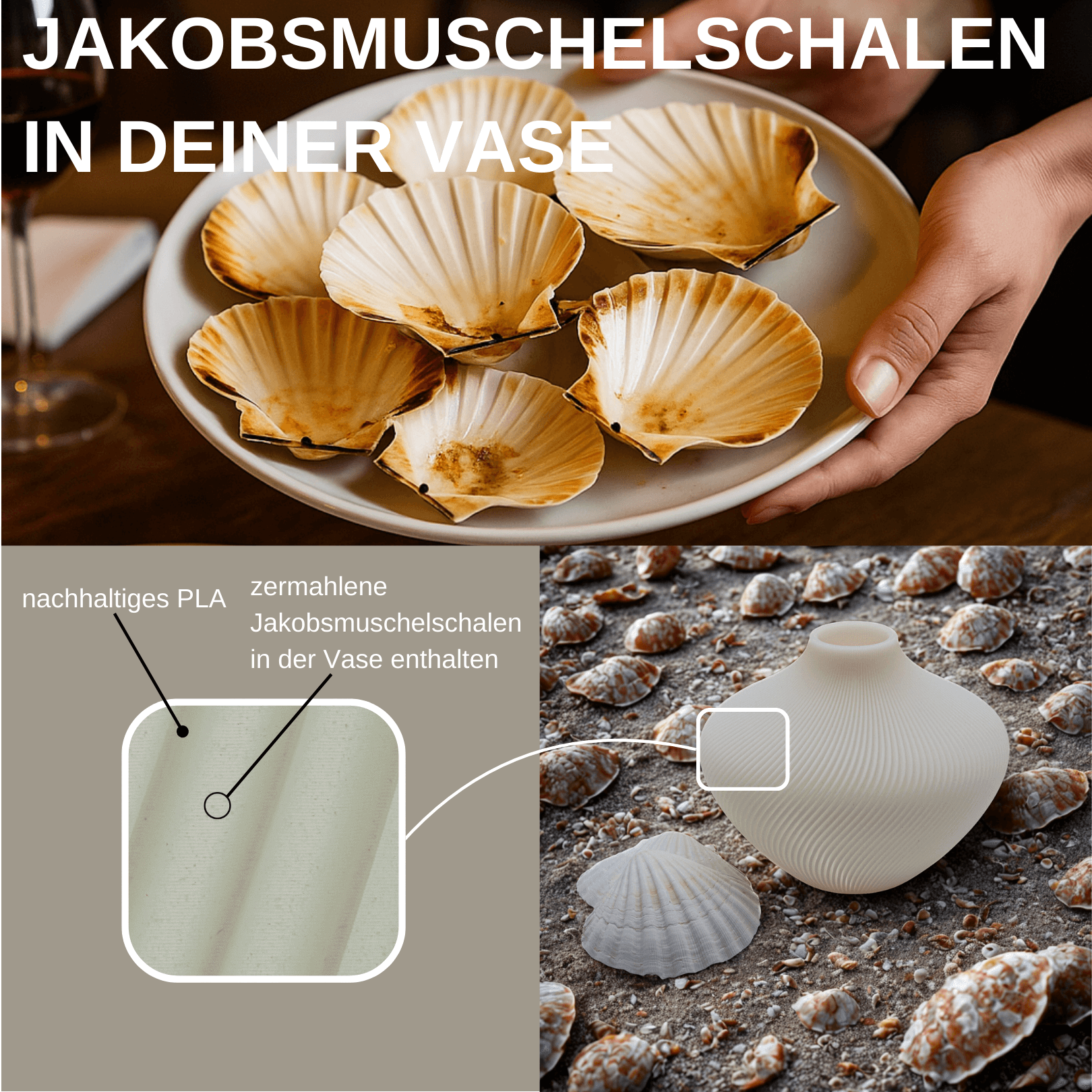 Das daraus entstandene 3D-Druck-Filament wird für die Fertigung der Vase verwendet – hell, edel und mit sichtbaren Jakobsmuschelanteilen.