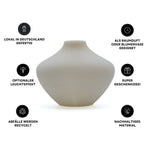 Ein Material, das nicht nur nachhaltig ist, sondern durch seine Zusammensetzung auch einzigartige Farben und Texturen erhält. Je nach Variante leicht lichtdurchlässig, entstehen spannende Lichtspiele, wenn du eine kleine Lichterkette in die Vase legst. So wird sie im Handumdrehen zum atmosphärischen Leuchtobjekt – stilvoll, sinnvoll und überraschend vielseitig.