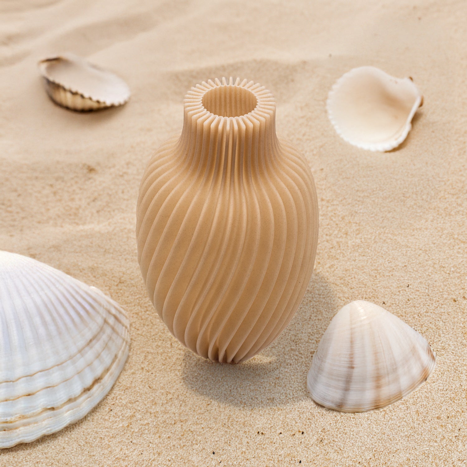 Mit diesem Material entstehen unsere Vasen im 3D-Druckverfahren – jedes Stück mit sichtbaren Muschelanteilen und einer einzigartigen Struktur